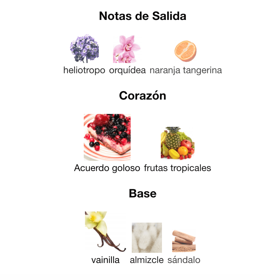 Imagina una malteada súper dulce y lactónica, con un toque de frutas tropicales que la hacen jugosa. No es un perfume empalagoso, es un dulce suave, atalcado y muy femenino. Es el perfume perfecto para sentirte tierna, coqueta y absolutamente deliciosa. Si quieres oler a un postre cremoso y recibir cumplidos todo el día, este es el indicado.